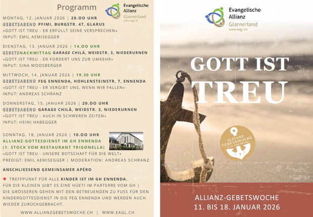 Von Montag, 12. bis Donnerstag 15. Januar 2026 treffen sich die Gemeinden und Kirchen der Evangelischen Allianz Glarnerland zu gemeinsamen Gebetsanlässen. Diese dauern in der Regel eine Stunde. Am Sonntag, 18. Januar 2026 um 10.00 Uhr feiern wir im GH Ennenda (1. Stock vom Restaurant Trigonella, beim Bahnhof Ennenda) einen gemeinsamen Abschlussgottesdienst. Wir freuen uns auch dir zu begegnen.